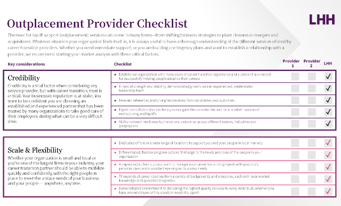 What defines success or failure when it comes to supporting laid off employees? This checklist provides the critical things to look out for when selecting a provider to support your impacted employees.